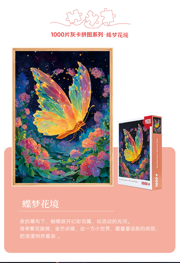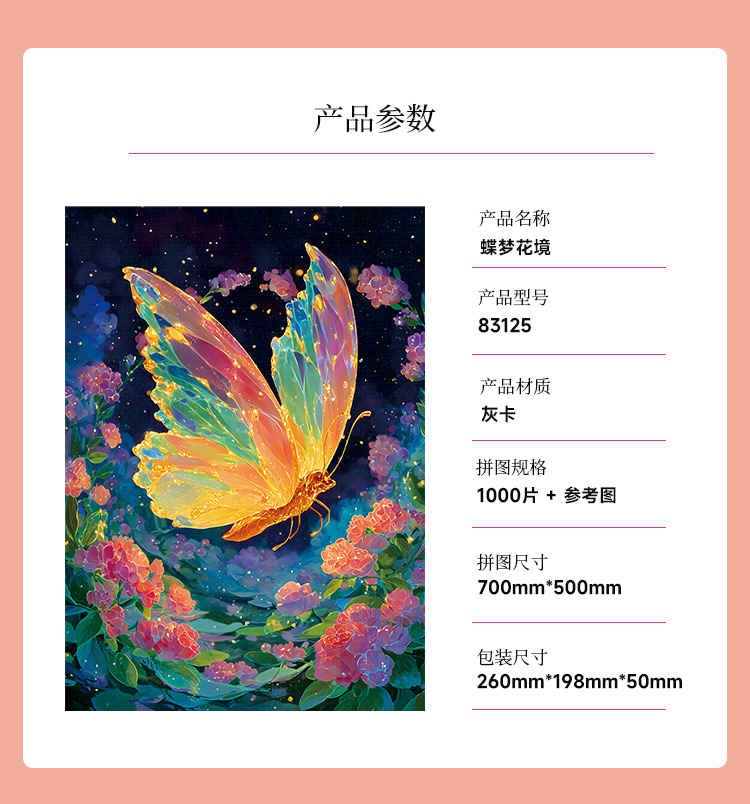 拼圖名稱:蝶夢花境-83125 拼圖尺寸:700*500MM 拼圖材質:紙質灰卡 拼圖片數:1000片 加工方式:廠規、來圖定制 包裝尺寸:180*130*50mm