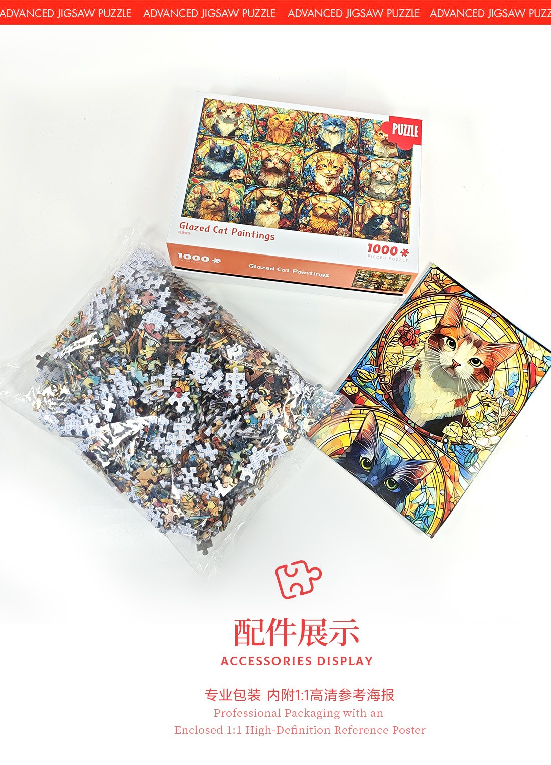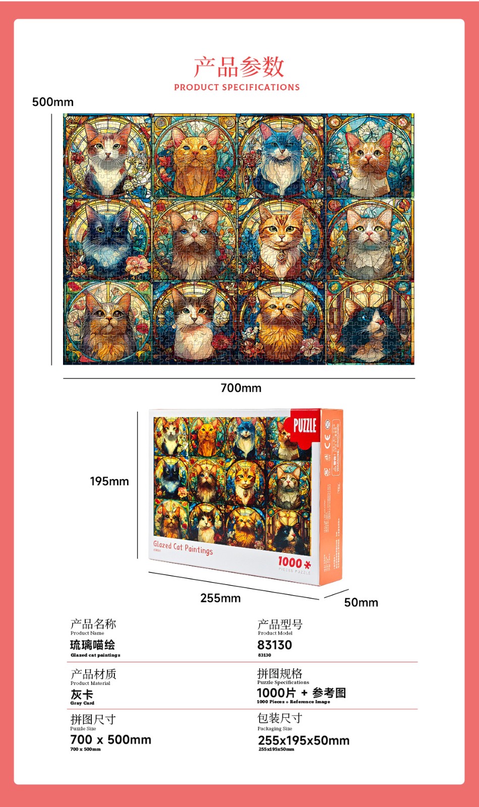 拼圖名稱:琉璃喵繪-83130 拼圖尺寸:700*500MM 拼圖材質(zhì):紙質(zhì)灰卡 拼圖片數(shù):1000片 加工方式:廠規(guī)、來圖定制 包裝尺寸:180*130*50mm